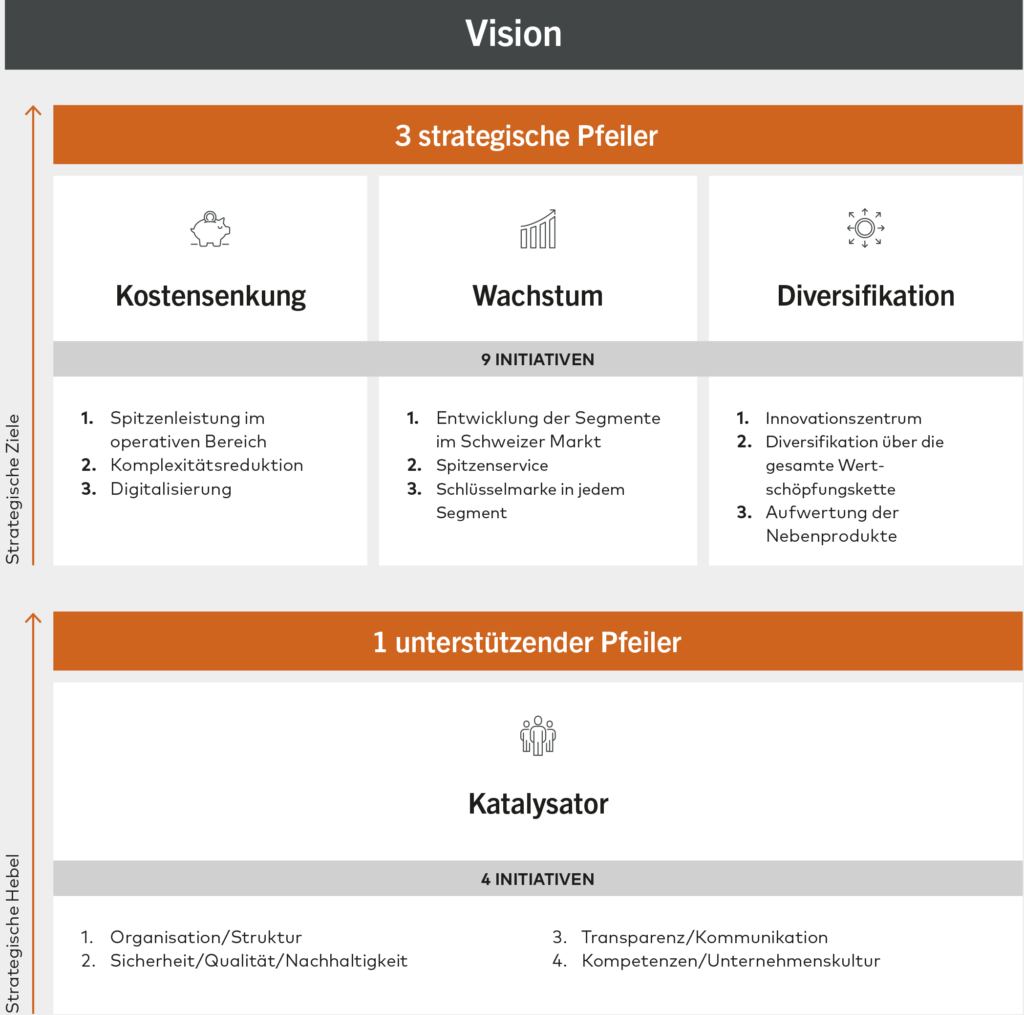 Auf der Grundlage von drei vom Verwaltungsrat festgelegten strategischen Pfeilern wurden Initiativen und Projekte konzipiert. Ein vierter unterstützender Pfeiler wurde hinzugefügt.